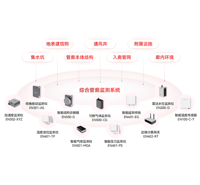 對管廊艙內結構的沉降、傾斜、震動和裂縫,管廊地表結構沉降、位移和傾斜,管廊艙內硫化氫氣體、甲烷氣體、溫濕度和氧氣,集水坑水位和孔口蓋板等數據實時監測,同時接入視頻圖像,為管線風險監測預警分析、廊內環境及附屬設施監測預警分析和管廊綜合監測預警分析提供數據支撐。
